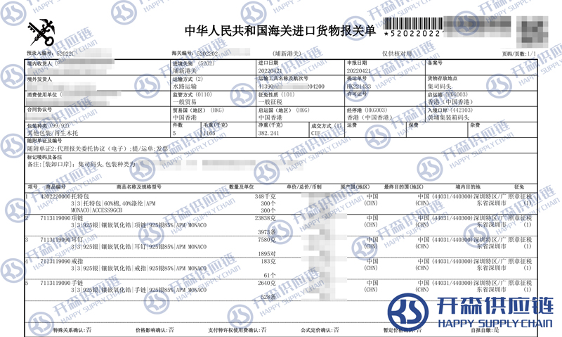 開森進口供應鏈擁有豐富的珠寶首飾進口報關操作經驗及案例,十余年操作經驗及案例可供參考,可按需定制珠寶首飾進口方案,幫助客戶解決進口難題,快速進口清關到港到貨。