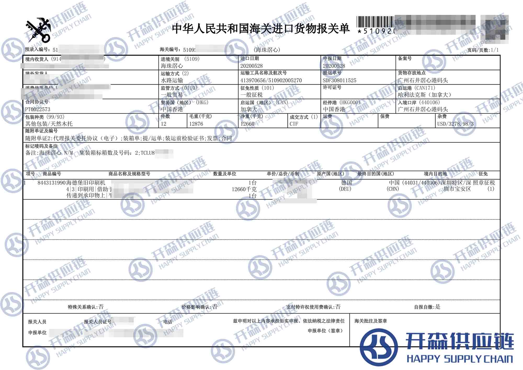 一、二手舊海德堡印刷機進(jìn)口報關(guān)代理案例詳情
