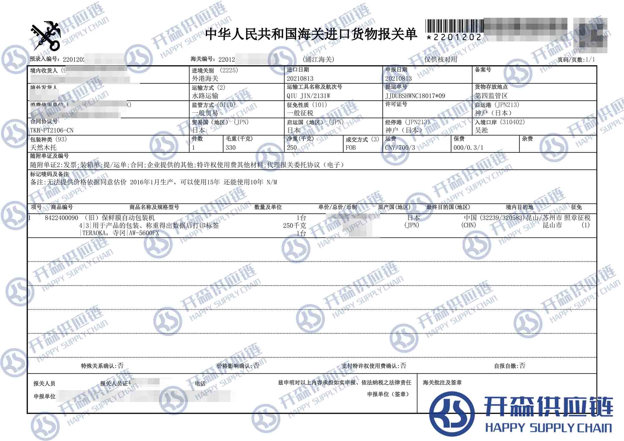 【本文結語】 上述就是上海港日本舊保鮮膜自動包裝機進口報關代理【進口案例】的全部內容,希望能對您有所幫助,如有二手機械進口報關上任何疑問及問題可隨時在線聯系我們或撥打 18002611553,開森供應鏈擁有豐富的二手機械進口報關操作經驗及案例,10余年進口經驗為您所用,各類進口疑難都能為您一一解答及協助快速處理解決!