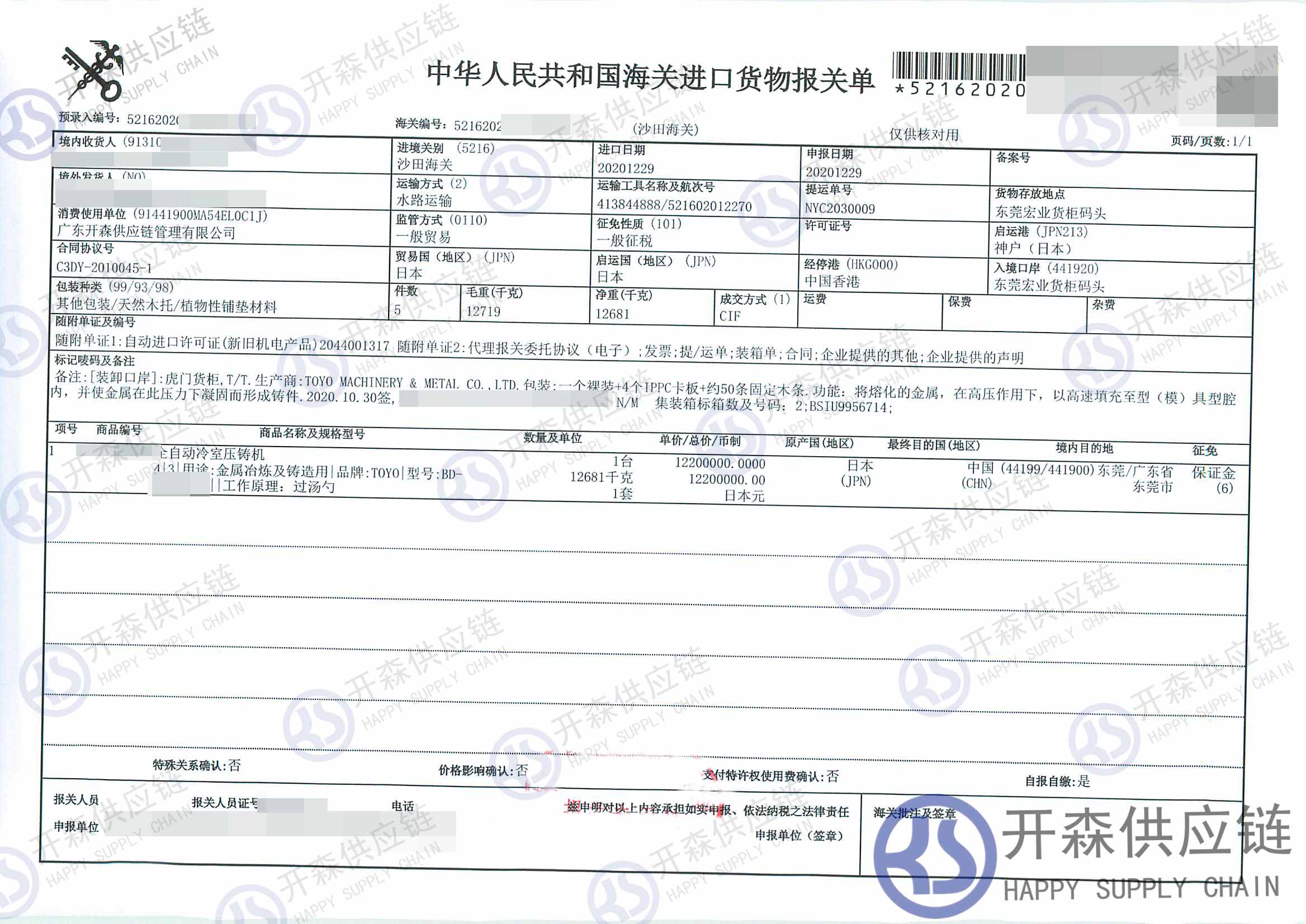 從日本進口全自動壓鑄機等到東莞碼頭,我司提供門到門進口一站式清關(guān)服務(wù),開森擁有十余年機械設(shè)備進口清關(guān)經(jīng)驗及案例,為客戶提供量身制作的進口方案,讓客戶進口省時省心省成本。