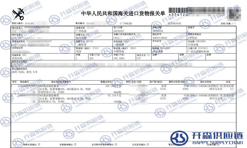 【本文結語】 上述就是美國DHA藻油進口報關代理服務【經典案例】的全部內容,希望能對您有所幫助,如有食品進口報關上任何疑問及問題可隨時在線聯系我們或撥打 18002611553,開森供應鏈擁有豐富的食品進口報關操作經驗及案例,10余年進口經驗為您所用,各類進口疑難都能為您一一解答及協助快速處理解決!